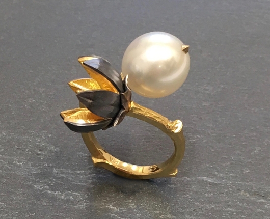 18ct and 22ct gold, patinated shakudo and gilding metal, Cygnet Bay pearl. Supreme Winner: 2017 Cygnet Bay Pearls Design Competition.